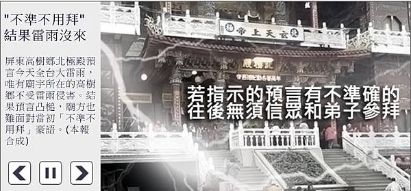 氣到當場走人,原來是這間宮廟的神明在2015年12月時,預言2016年國曆4月9日全台會下大雷雨,只有廟宇所在地高樹不受影響,可以舉辦遶境活動,甚至誇下豪語說「不準的話,往後無須信眾和弟子參拜」,網友挖出當時的影片,所謂的預言,其實是宮廟主委拜託神明「表演絕招」。