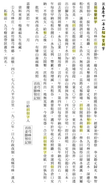立招佃墾耕字竹塹九芎林庄佃首姜勝智緣九芎林庄田園于乾隆伍拾參年經蒙泉州府