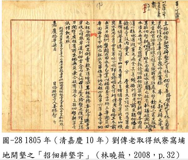 嘉慶10年劉傳老向九芎林佃首姜勝智取得紙寮窩埔地開墾之「招佃耕墾字」