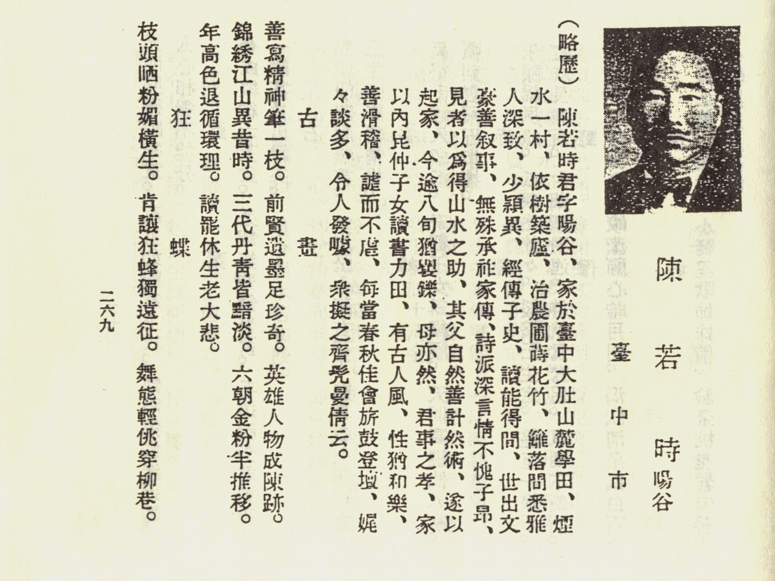 所謂地靈人傑,聚奎居這幢近百年的豪宅孕育了烏日鄉近代傑出的詩人—陳若時。陳若時致力於於傳統詩的創作,筆名暘谷,是日治時代中州詩社的著名詩人。他從小就非常聰敏好學,勤習漢學,當時學田村有很多俗稱漢學仔的私塾教授漢文,陳若時就是附近一帶有名的老師。