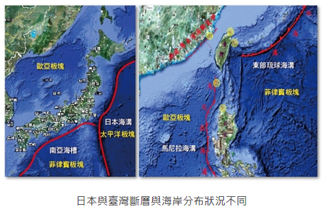 依據大型地震紀錄,日本東北外海有大型海溝斷層,所以 500 年來多次發生矩震級 Mw8 以上的超大規模地震;台灣雖然常有地震,但外海沒有平行海岸的大型海溝斷層,所以即使發生地震造成海嘯,海嘯也不容易直撲海岸釀成災害,衝擊遠低於日本。我國已建構嚴密地震與海嘯監測網絡,準備各種防災措施,保障民眾安全。