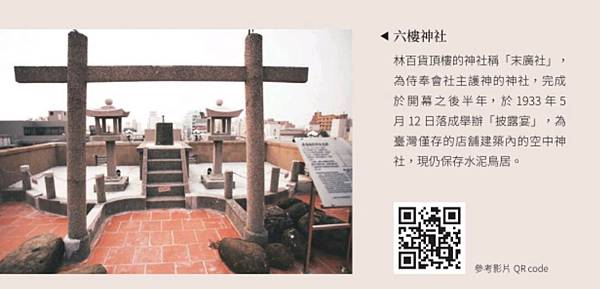在五樓,有一個林方一家人共同生活的場域,也充作食堂使用,有個小鐵梯可上到六樓(頂樓),一旁是我朝思暮想的「頂樓神社」,林百貨構內社(構內社指設立於某機構內的附屬神社)由於是設置在營利場所,因此神社性質為「稻荷神社」,出自於日本的稻荷信仰,常見的主祭神為稻倉魂命,稻荷神原本為五穀神,後來才轉變成為囊括了商業經營的神祇,總社為京都的伏見稻荷大社。當然林百貨構內社的規模不會太大,小巧的鳥居配上兩座石燈籠,便成了整座神社的外觀。從神社旁可以走天橋進到電梯間,一旁的牆壁上還保留有二戰期間遭掃射的彈孔。