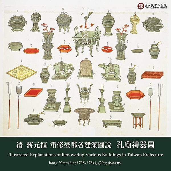 This work on "Illustrations of Ritual Vessels at the Temple of Confucius" comes from Illustrated Explanations of Renovating Various Buildings in Taiwan Prefecture. In 1776, Jiang noted, "All the vessels used at the Temple of Confucius in Taiwan Prefecture are made of lead-tin bronze, which is of humble quality. The 'dou,' 'bian,' 'fu,' and 'gui' vessels also do not conform to the norms, and many are missing." Therefore, "I, Yuanshu, carefully consulted Confucian regulations and selected artisans in Suzhou to establish a workshop, purchase bronze, create a foundry, and cast instruments for music and the rites. I spent more than 10,000 cash and had them shipped to Taiwan." In the following year, he wrote an inscription and Directors Chen Zuolin (fl. ca. 18th-19th c.) and Lin Chaoying (1739-1816) engraved a stone stele, which is now at the Temple of Confucius in Tainan and an important early document on the veneration of Confucius in Taiwan.