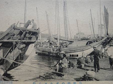 1900年左右,淡水河大稻埕碼頭的戎克船,右側岸上為洋行建築