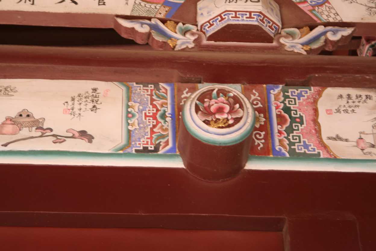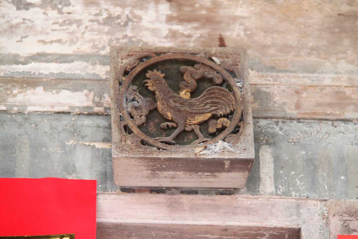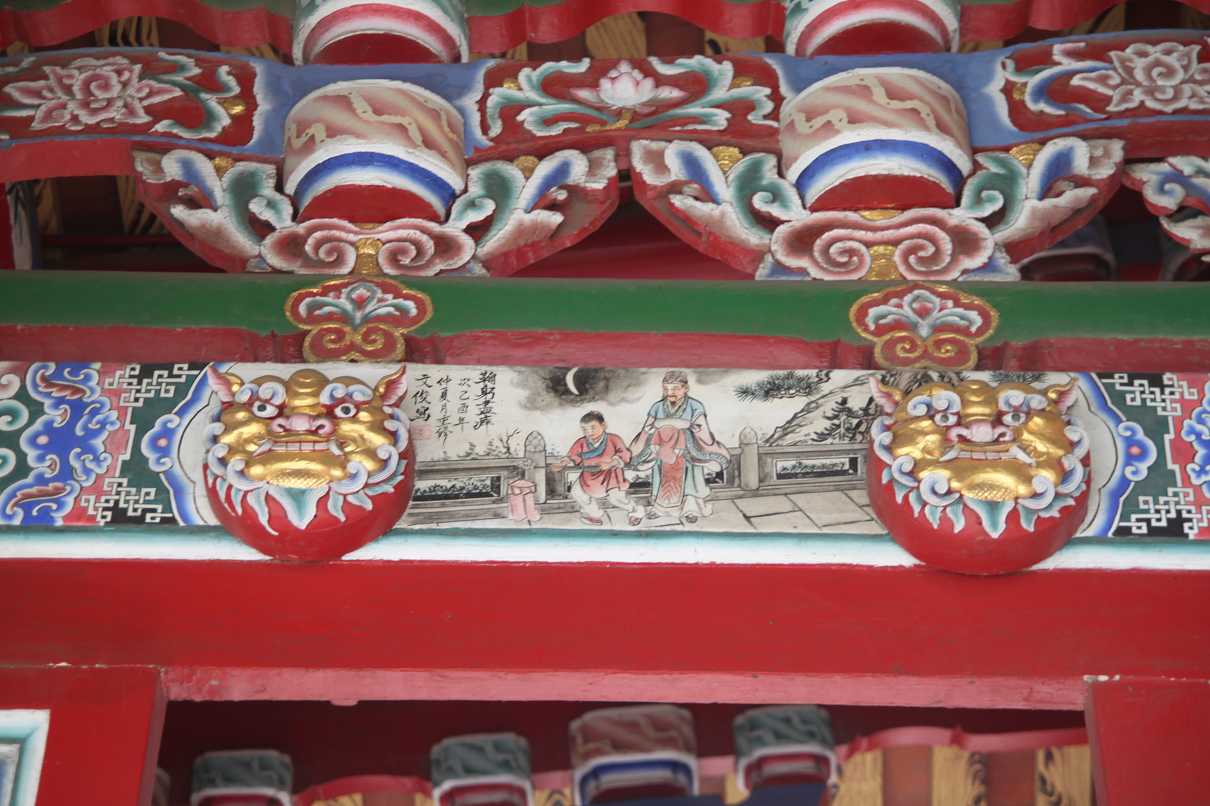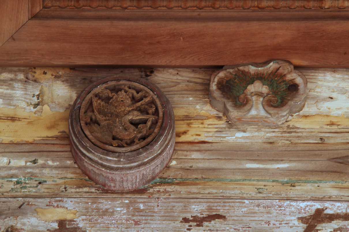 門廳大門兩側通往內護龍的側門上,樑上「一邊雕琴,一邊雕瑟」,表示「琴瑟和鳴」,下面是夔龍束木雕功細緻。「福」字門印下有一幅石雕對聯:「安仁惟宅知其所止、泰階有道奠厥攸居」,對聯框分別刻有壽桃圖形,應該表示「長壽」吧!