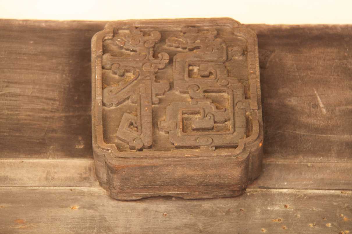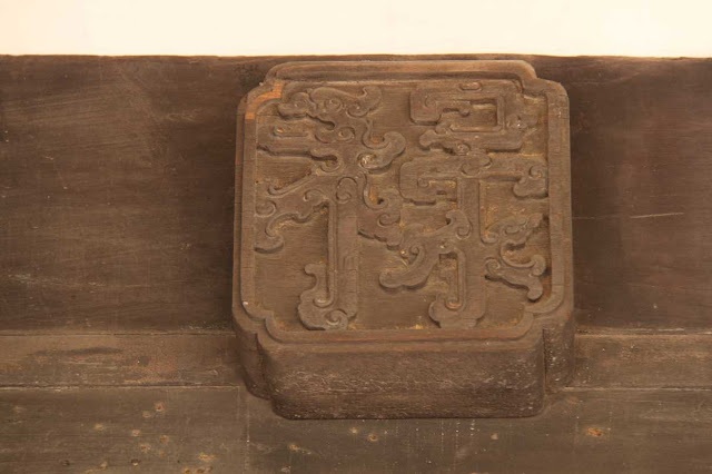 宜蘭縣立蘭陽博物館 門印,以浮雕技法呈現外框紋飾與中間文字,表面施有紅色彩繪,凸出之圖文飾以金漆。廟門左右門柱最上方印璽。有避邪作用。門印-文化部-典藏網-藏品資料-2003L040173 https://bit.ly/4heP6Sr