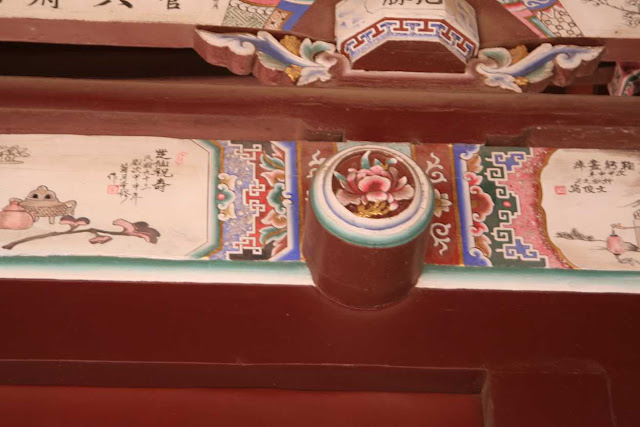 正廳入口上方的橫披窗,經計算後是由一百零五朵花朵所構成,門楣上之門印以篆文刻「福」、「祿」兩字