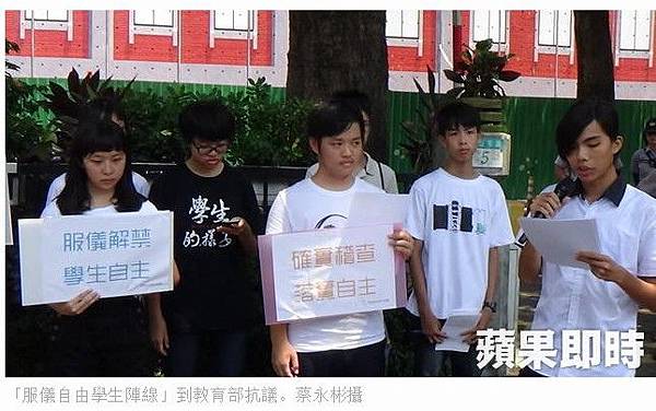 教育部去年8月宣布鬆綁高中、職服裝儀容,學生可選擇穿著制服、體育服或學校認可的班服、社團服裝進出校園,上衣和裙子或褲子可以任意搭配。「服儀自由學生陣線」約20人今到教育部門口大喊「服儀自由!」「學生無罪!」等口號,抗議仍有許多學校以「學生服儀違規」為由要學生「愛校服務」,有些私立學校不只沒改規定,甚至還有髮禁。服儀自由學生陣線總召、東華大學學生蕭竹均表示,目前台中二中、新竹中學、台南女中、北一女中、高雄中學都還有不合理的規定。他說,衣著是展現人格、展現自我的象徵,學生不是工廠裡的機器人,希望教育部嚴格督導各校狀況。北一女蔣姓學生表示,校方會對不符學校服儀規定的學生開「勸導單」,學生必須參加愛校服務,但都是在打掃、做「雜工」,「沒有人認為愛校服務不等於懲罰」。雄中畢業生凃峻清表示,學生出入校園還是要穿全套制服或運動服,有違教育部宣布可自由「混搭」的規定,學生還可能遭輔導室登記、通知家長,或寫在生活表現紀錄內。竹中徐明華質疑制服「何來的教育意義?」,認為只會把學校變得像軍隊,學生失去自己的主體性,變成另類機器人。教育部國民及學前教育署署長邱乾國出面回應,國教署會行文宣導規定,並要求各校再檢視,未來會成立學生專屬的申訴管道,建立討論平台;國教署將建置「學生事務輔導團」,幫助各校了解相關規定,他也將在每學期撥出「署長與青年有約」時段,直接聽取學生意見作為政策參考。(蔡永彬/台北報導)