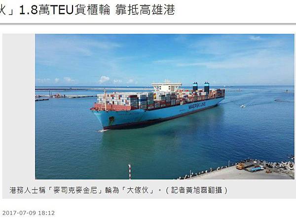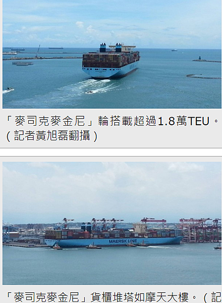 港務公司說,目前海運市場上營運中的1.8萬TEU以上巨型貨櫃輪近年來陸續下水,更是未來各主力航商遠歐、美西航線將常態性配置貨櫃輪,高雄港二港口迴船池水深達17公尺、直徑600公尺,貨櫃碼頭多達26座以上,具高效率港勤及碼頭服務與專業的引水人領港作業,能充分提供1.8萬TEU貨櫃輪靠泊的優質服務。(吳可蘭編)