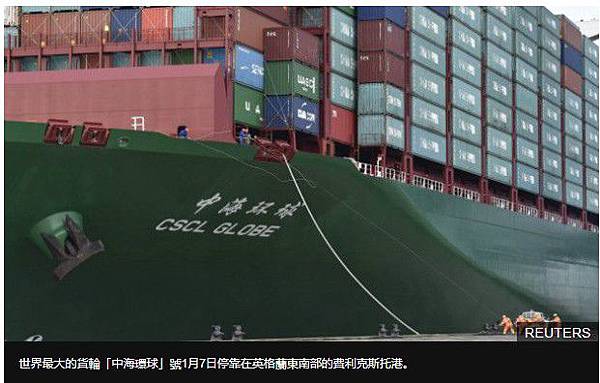 世界最大的貨輪「中海環球」號1月7日停靠在英格蘭東南部的費利克斯托港。