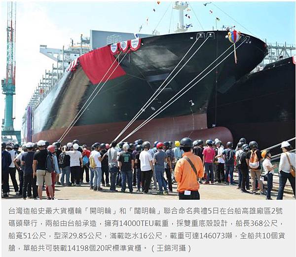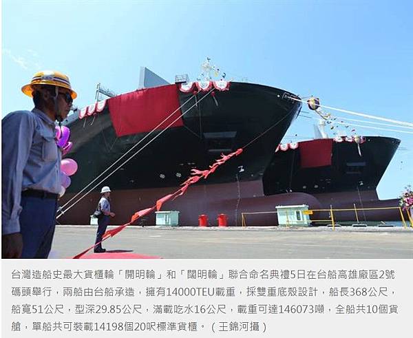 台灣造船史最大貨櫃輪「開明輪」和「闊明輪」5日在台船公司高雄廠區2號碼頭聯合命名,「開明輪」6日交船,為首艘投入營運,「闊明輪」則預計5月底交船。兩艘大型貨櫃輪造船工程,結合了中鋼的優質鋼材和台船的造船技術,見證了台灣過去十大建設所奠定下來、後來經常被嫌棄的的重工業基礎,而新政府未來將推動國艦國造的主要產業基地就在高雄。