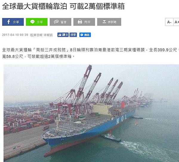 全球最大貨櫃輪「商船三井成就號」8日輪順利靠泊青島港前灣三期貨櫃碼頭,全長399.9公尺、寬58.8公尺,可裝載超過2萬個標準箱。