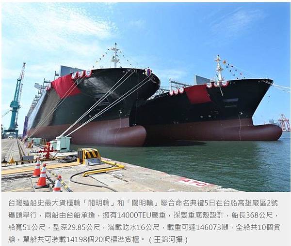 台灣造船史最大貨櫃輪「開明輪」和「闊明輪」聯合命名典禮5日在台船高雄廠區2號碼頭舉行,兩船由台船承造,擁有14000TEU載重,採雙重底殼設計,船長368公尺,船寬51公尺,型深29.85公尺,滿載吃水16公尺,載重可達146073噸,全船共10個貨艙,單船共可裝載14198個20呎標準貨櫃。(王錦河攝)