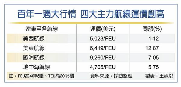 每TEU(20呎櫃)運價達到4678美元+每FEU(40呎櫃)達7036美元 https://is.gd/Fyk5CZ