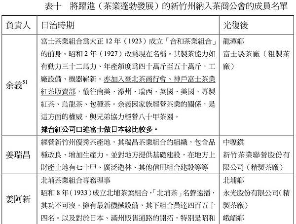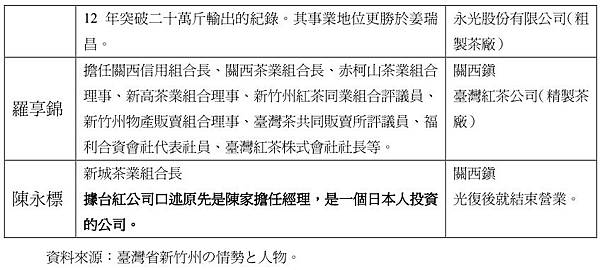 續經營的看法。「【早期客家人】有做茶,也是無名英雄,他根本就沒有行號,也沒有在買賣,根本談不上影響力。…我們常講客家人真正精製茶葉、好像大量進入茶業界然後把它變成企業化,變成很大的外銷產業,這客家人的貢獻很大,主要是這點。」「世界那個時候有一個世界論壇就說:『啊!茶業產值很少,好像不重要。』這個是他們的看法,不重要。其實你看很多農村很多農民都是靠這吃飯的,你說這不重要。是賺多少外匯重要還是…比如說像一萬人有比較安定的工作比較重要,還是多賺一億兩億美金重要。」(台灣紅茶公司)第二,相較桃竹苗地區的多數製茶業者很早外銷經驗,與同為地方菁英的姜阿新或姜瑞昌家族創業過程有所不同,他們強調交易對手不應只侷限某一方,可以降低經營的風險,還將茶經營的產製銷整合,藉以減少中間人剝削而增加利潤,這種作法使他們現今仍可以持續營運下去的主因。