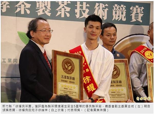 新竹縣「徐耀良茶園」獲評鑑為製茶環境衛生安全5星等的優良製茶廠,農委會副主委黃金城(左)親自頒獎表揚,徐耀良由兒子徐維伸(白上衣者)代表領獎。(記者黃美珠攝)
