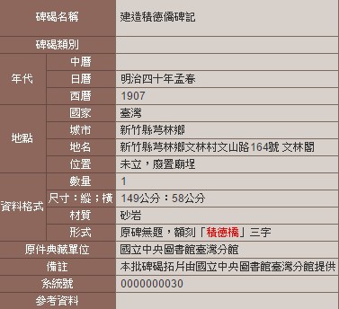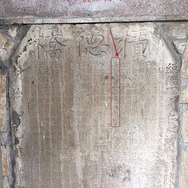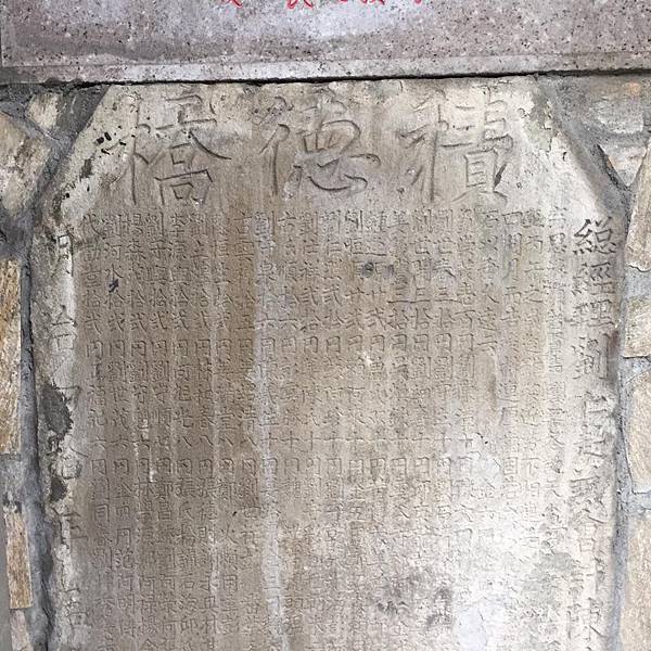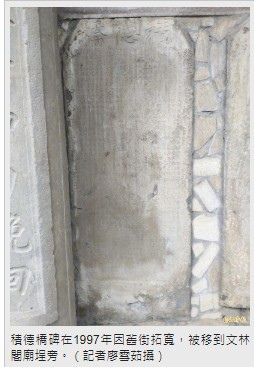 積德橋碑在1997年因舊街拓寬,被移到文林閣廟埕旁。(記者廖雪茹攝)