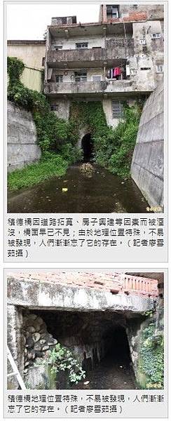 積德橋因道路拓寬、房子興建等因素而被湮沒,橋面早已不見;由於地理位置特殊,不易被發現,人們漸漸忘了它的存在。(記者廖雪茹攝)