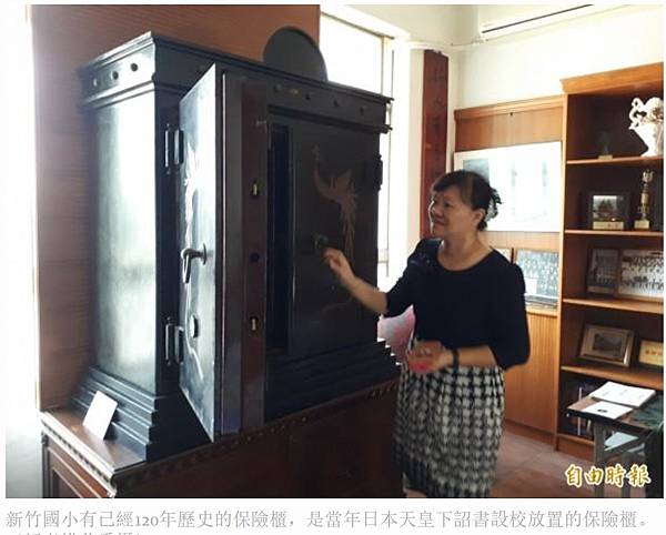 張淑玲說,新竹國小有很多老寶貝,在校史館「奉天室」內,就珍藏著已120年歷史的保險箱,這個百年保險櫃,像現代銀行的保險櫃,有4層厚厚的門,裏面放的就是當年由日本天皇頒發的設校「詔書」,校史館內也珍藏許多珍貴校史文物,像用毛筆書寫的學生優良手冊,歷年校長照片及各種歷史刊物,還有創作「妹妹揹著洋娃娃」的古老風琴和李澤藩的畫作等。