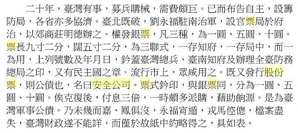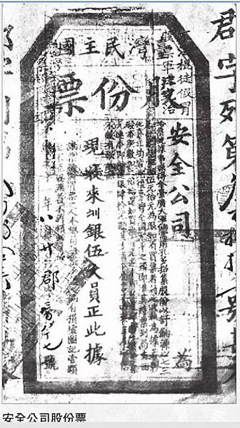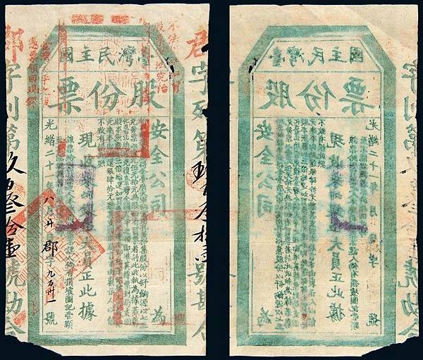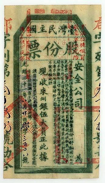 台灣民主國為籌湊龐大軍需而發行的「股分票」--1895年乙未臺灣民主國安全公司在臺南發行股份票伍大員正