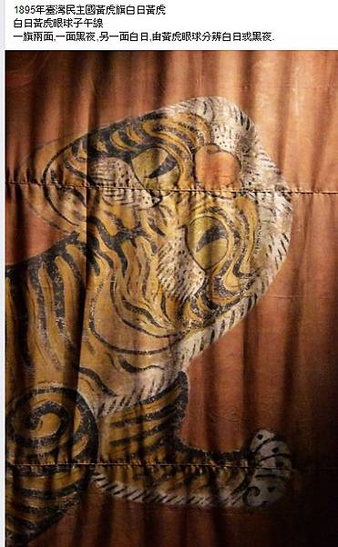 當時為表象徵,「台灣民主國」的藍地黃虎國旗。龍為大清,虎為台灣,龍在天,虎在地,以示尊卑;虎首向內,尾高首低,以示臣服於清。另有乙顆『民主國之寶璽』黃金鑄造的印璽。隨著一百五十多天的抗日戰役,直到1895年11月18日結束。遺留下兩面虎旗,黃地黃虎旗及藍地黃虎旗而最具象徵的『民主國之寶璽』卻遺失了~