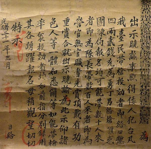余清勝為起蓋兵勇營房曉諭圭崙嶺地方人民告示-本告示為頭品頂戴統領台北隘屯防軍砲隊等營記名簡放總鎮靖勇巴圖魯余所出示的曉諭告示。內容為余清勝統領奉唐景崧巡撫調派,將隘勇後營及新募之勝果砲隊駐紮圭崙嶺(即今桃園縣龜山鄉),一開始都是搭設帳棚