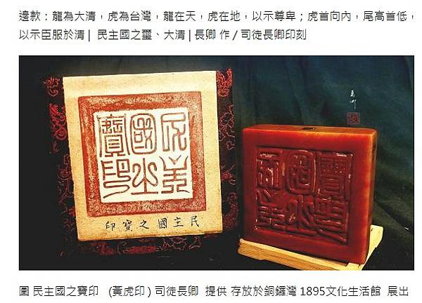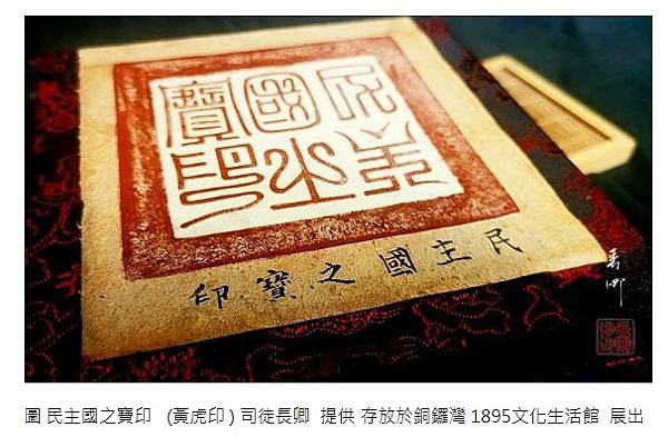 『民主國之寶印』在哪呢?怎沒展出?因為,這顆寶璽遺失了,目前博物館只有展示兩面旗子,那到底『民主國之璽』長的如何呢?我們現在也只能在網路上看見印面長這樣~ [圖 民主國之璽 (黃虎印 ) 印面翻拍自網路]1895 乙未 民主國的歷史背景~
