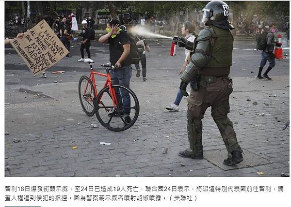 智利史上最大示威百萬人上街,總統宣布解散內閣、解除宵禁 -自1990年皮諾契特(Pinochet)軍事政權結束後,政府首次動用軍隊平息動亂。大約2萬軍警部署在市區,社群媒體並瘋傳有關安全部隊毆打民眾的影片 http://bit.ly/2Ppaieg