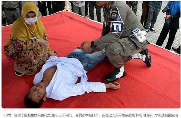 (法新社印尼怡得5日電) 一名印尼男子因婚前性行為,今天被執行100下鞭刑。一度暈倒的他醒來後繼續被抽打,直到完成100下鞭刑才被送往醫院治療。