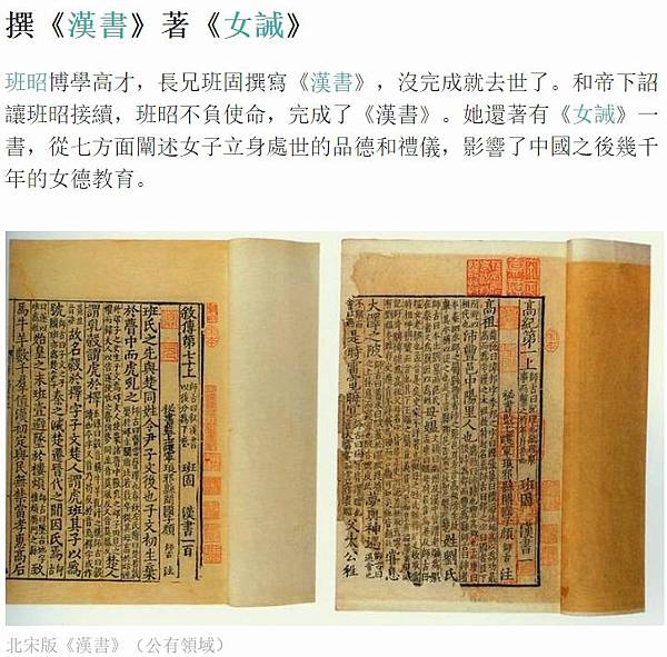 班昭以她的文采,完成了哥哥班固的《漢書》打動漢和帝的心,使哥哥班超回歸洛陽。班昭的文采還表現在她寫的《女戒》七篇上。