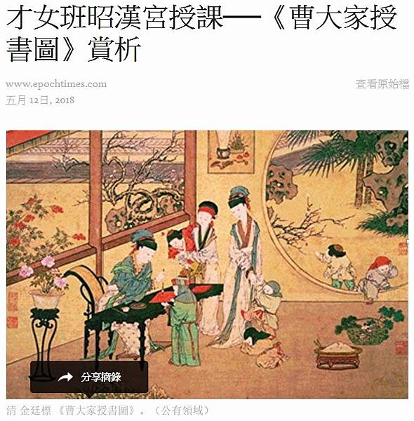 班昭本人常被召入皇宮,教授皇后及諸貴人誦讀經史,在宮中被尊稱為老師。