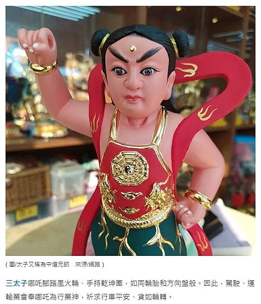 在民間信仰中認為哪吒為玉皇大帝駕前的中營神將,統率五方營神將神兵,因而稱為「中壇元帥」,能降魔除妖,成為鎮守宮廟的主帥護法神。在造型上,三太子以頭挽雙髻、身穿紅色圍兜、手執矛鎗與圓環、腳踏風火輪的可愛童子模樣。特別是乾坤圈與風火輪的法器,如同輪胎和方向盤一樣,象徵著行動便捷無阻,所以許多職業的駕駛人,如貨車司機、計程車司機、遊覽車司機等,往往供奉為守護神,會在車上放置一尊小型的三太子神像,祈求行車平安。此外,現在最興盛的自行車業者也可仿效供奉為行業神,相信駕馭神力無人能比的三太子,定能庇佑生意興隆。