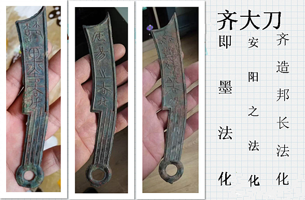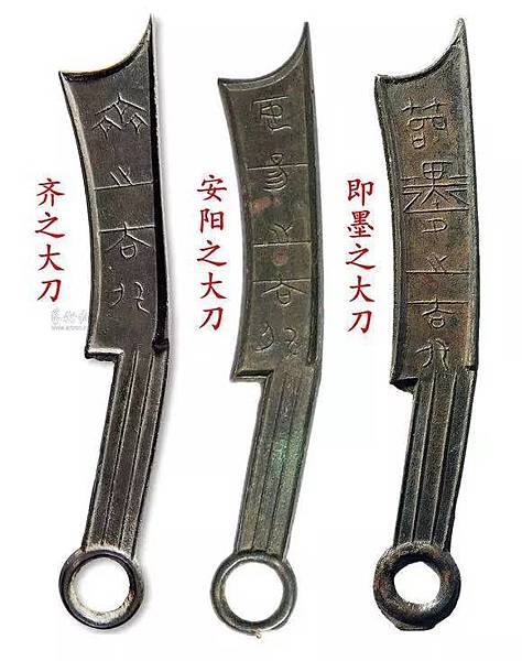 齊國早期刀幣有“齊之大刀、安陽之大刀、即墨之大刀三種”,分別鑄造發行於臨淄、安陽、即墨。