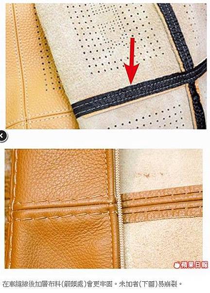 在車縫線後加層布料(箭頭處)會更牢固。未加者(下圖)易崩裂。