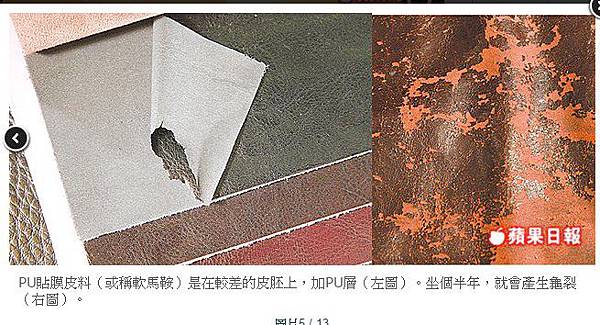 PU貼膜皮料(或稱軟馬鞍)是在較差的皮胚上,加PU層(左圖)。坐個半年,就會產生龜裂(右圖)。