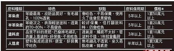 皮料依等級可概分成苯染皮、半苯染皮與塗料皮(或稱磨面皮)。舒富樂家具總經理陳三能表示,一頭牛的牛皮可分成好幾層,苯染皮就是等級高的皮層:第1層皮且表面很少傷痕,此種皮表面不必打磨,人工加工處理最少,只有加染料染色,故稱為苯染皮;半苯染皮的皮料也很好,但表面傷痕多了點,表面會再加層輕塗料;塗料皮就是等級較差的皮料,因此表面會打磨,再加重塗料,一般1+2+3整套半牛皮沙發,用的就是塗料皮。各種皮料的優缺點可參看以上表格。
