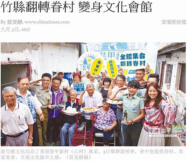 新竹縣唯一以眷村作為歷史建築的登錄點,就是湖口鄉的裝甲新村(乙村),3日上午由新竹縣文化局、縣長邱鏡淳邀請軍方、眷村老伯伯、原住戶及在地居民齊聚一堂,訴說當時老故事,也呈現外省及客家美食,氣氛融合。新竹縣文化局預計分3期,重現眷村樣貌並展現當年生活狀況。