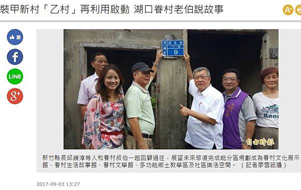 分享裝甲新村「乙村」再利用啟動 湖口眷村老伯說故事到Facebook 分享裝甲新村「乙村」再利用啟動 湖口眷村老伯說故事到Line 分享裝甲新村「乙村」再利用啟動 湖口眷村老伯說故事到Google+