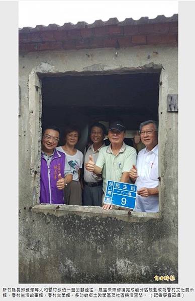 新竹縣長邱鏡淳等人和眷村叔伯一起回顧過往,展望未來修復完成能分區規劃成為眷村文化展示館、眷村生活故事館、眷村文學館、多功能鄉土教學區及社區樂活空間。 (記者廖雪茹攝)