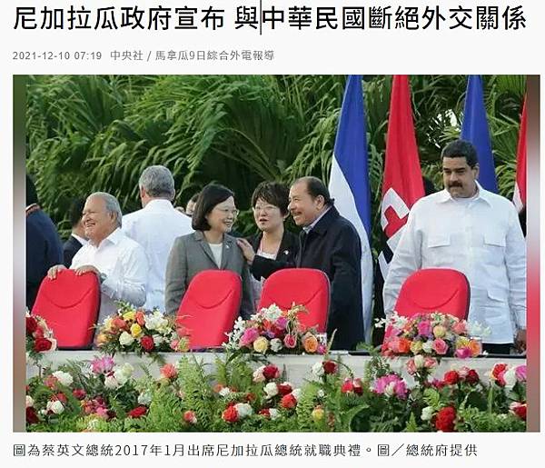 尼加拉瓜宣布「與台灣斷交」:世界只有一個中國2021/12/10