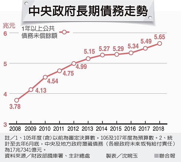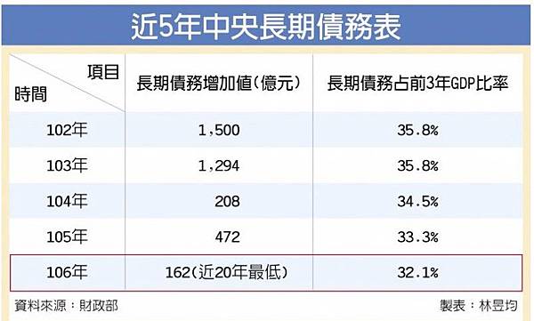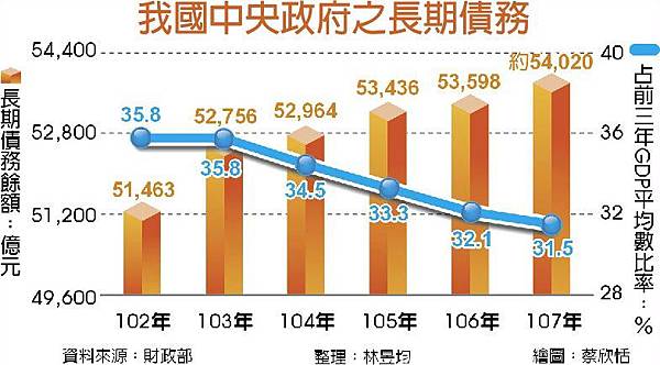 2018年度總預算因歲入執行良好,是我國自2009年以來,中央首次未舉債-去年各級政府長債達6.23兆,較2017年增加271億元,占前3年度GDP平均數比率為36.4%,也低於法定比率 50% https://is.gd/kfBB2y
