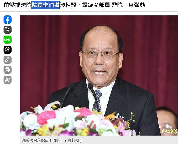 前懲戒法院院長李伯道涉性騷、霸凌女部屬 監院二度彈劾 - 政治 - 自由時報電子報 https://bit.ly/4mnALGc