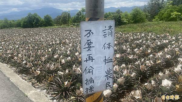 這3面告示牌出現在鹿野與延平鄉交界,告示牌旁的園內滿是鳳梨,近期即將收成,2面告示牌各面對馬路南北向,寫著「請體恤農民,不要再偷摘採」,希望路過駕駛或小偷別再下手,反映出農民滿心無奈,消極拜託偷兒手下留情。