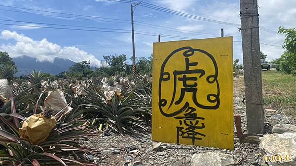 〔記者劉人瑋/台東報導〕台東縣鹿野與延平鄉交界的鳳梨田,最近立著3面告示牌,其中2面面對馬路,希望偷兒不要偷摘鳳梨,另一面則像符咒且面對山區,寫著大大的「虎」、「急降」,由於當地猴患嚴重,附近農民和法師判斷,較可能「畫給猴子看」或求雨。