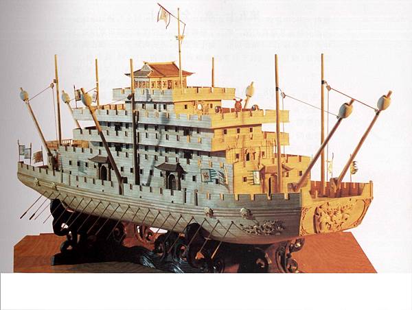 船上有5層樓,高百餘尺,左右前後設置6台拍竿,高50尺,可容戰士800人.