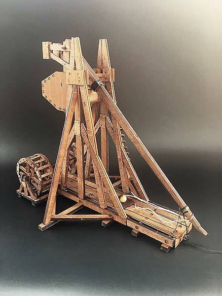 投石機的工作原理很簡單。 配重抬起,投石機撬高;當投石機發射時,配重降下,系統的勢能轉換成動能與勢能之和。 拋射物經歷擺動后沿軌跡在特定點釋放,釋放點發生在投石索一端從擺動臂頂端滑離時。