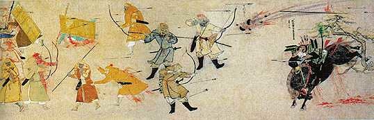 元兵入侵日本的戰鬥圖,注意圖中的震天雷是碎裂狀,而非炸裂狀,這是燃燒的陶罐投擲中途碎裂。