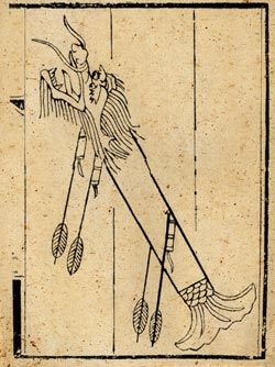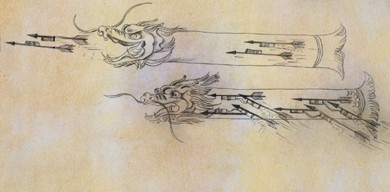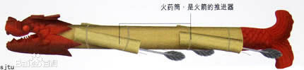 《武備志》載文大意為:用茅竹五尺,去節,並用鐵刀刮薄。前後各裝上一個木製的龍頭、龍尾。龍頭的口部向上,龍腹內裝神機火箭數枝,把火箭的藥線總連在一