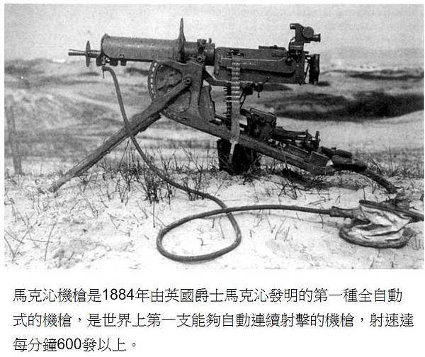 馬克沁機槍是1884年由英國爵士馬克沁發明的第一種全自動式的機槍,是世界上第一支能夠自動連續射擊的機槍,射速達每分鐘600發以上。