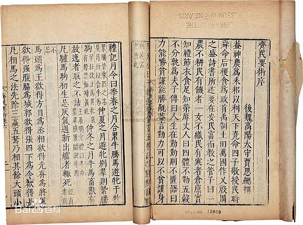 《齊民要術》大約成書於北魏末年(公元533年-544年),是北朝北魏時期,南朝宋至梁時期,中國傑出農學家賈思勰所著的一部綜合性農學著作,也是世界農學史上最早的專著之一,是中國現存最早的一部完整的農書。[1]